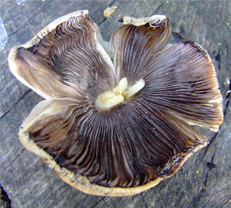 larges, serrées, d'abord blanches puis gris-brunâtre, noirâtre et enfin noires, adnées |
