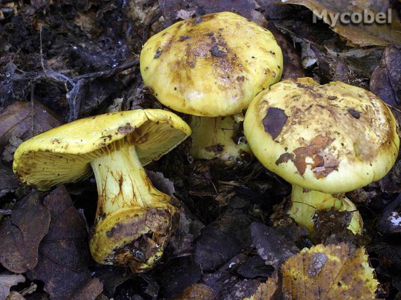 confusion avec le tricholome équestre, qui pousse exclusivement sous les conifères des zones non calcaires, il n'a ni bulbe ni chair jaune vif. |