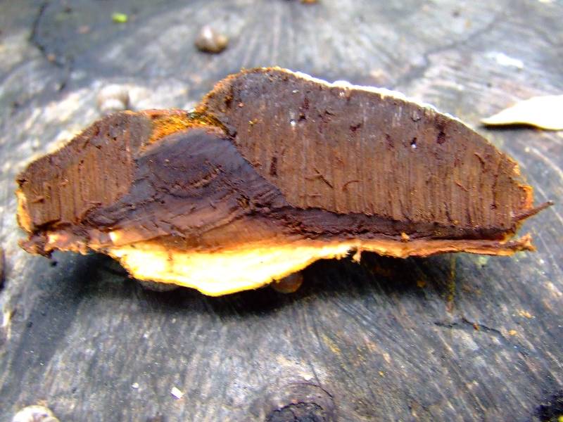 10 à 30 cm de large et j'usqu' à 20 cm de profondeur et 3 cm d' épaisseur.En forme d' huitre rouge brillant et noir pourpré.Les pores sont blanchâtres, les tubes bruns. |