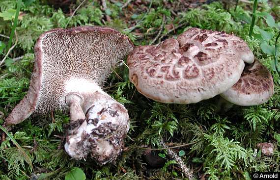jusqu'à 30 cm, irrégulier, très épais, parsemé de plaques imbriquées, gris noir. |