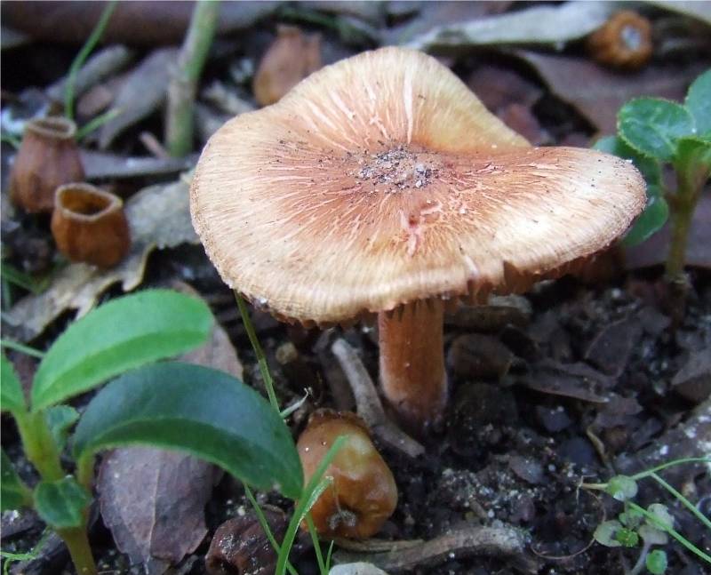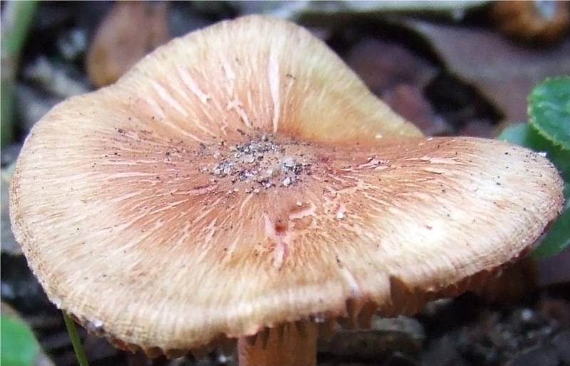 1,5 à 4 cm de diamètre, conique, s'étalant avec un mamelon au centre, fibrileux ou vergeté, souvent fendu sur la marge, crème ou beige, devenant rouge orangé. |