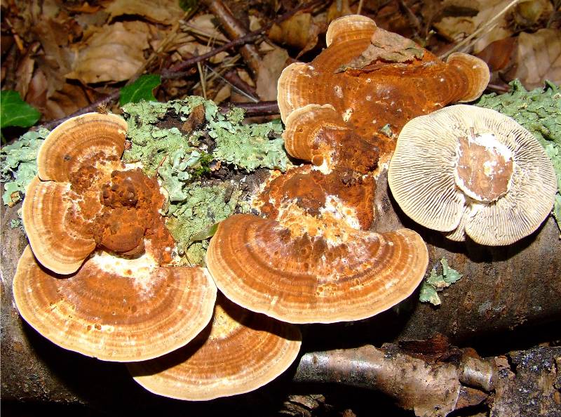 de 2 à 10 cm de large, de 0,3 à 1cm d'épaisseur, semi-circulaire lorsque croissant sur le côté d'un tronc, circulaire et fixé par le centre lorsque sur le dessus ( photo ci dessus ), brun roussâtre au centre, puis orangé et blanc au niveau de la marge, irrégulier,bosselé, verruqueux, velu, |