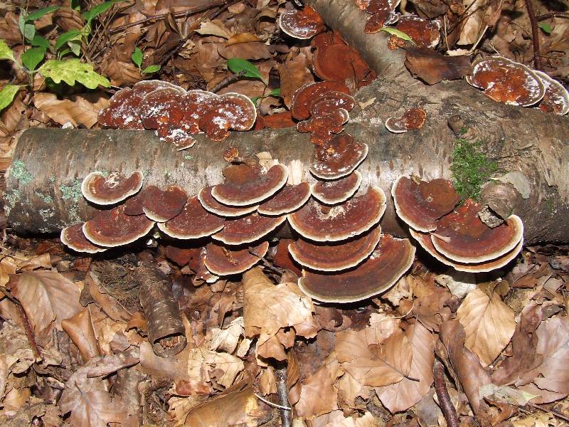 sur bois mort de feuillus ( hêtres, bouleaux... ) et de résineux, en nombreux chapeaux en console étagées tout au long des branches.Très fréquent toute l'année. |