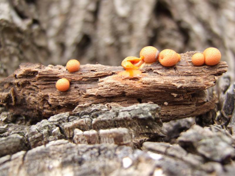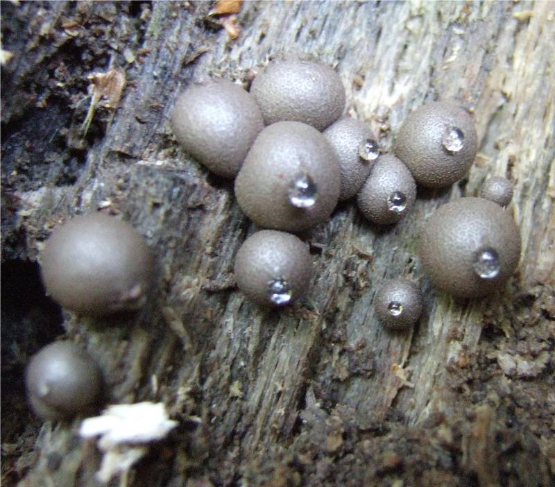 forme globuleuse de quelques millimètres à 2 cm, rose à orangé, molle, devenant irréguliere par compréssion, écrasée avant maturité, l'enveloppe grisonne, passe au brun-rouge puis au noirâtre, laissant perler des goutelettes par temps humide. |