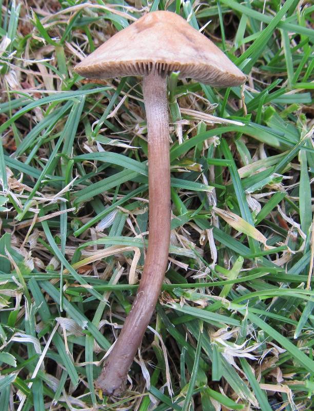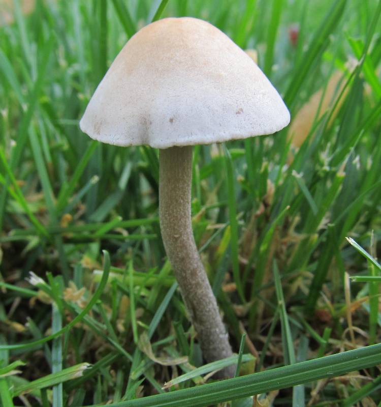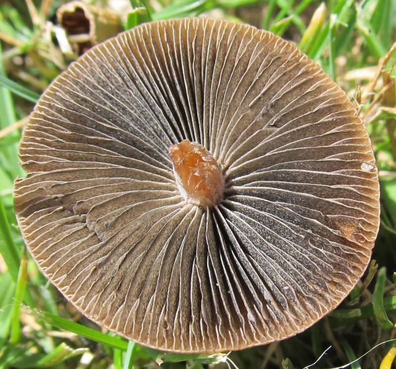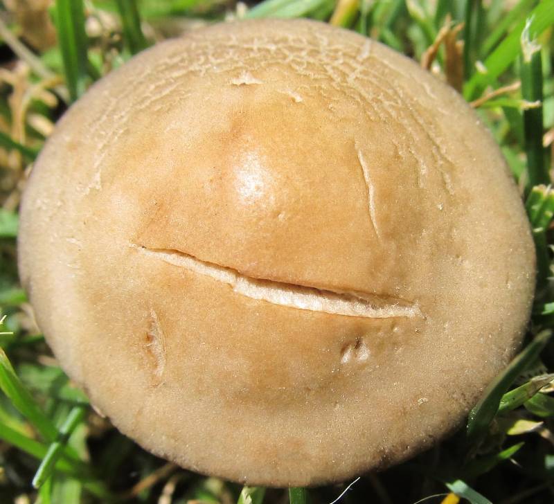 1 à 3 cm de diamètre, convexe à campanulé, lisse, brunâtre, crème ou grisâtre par temps sec, hygrophane, marge un peu translucide et striée à l'humidité. |