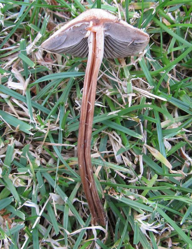 7 à 10 cm de haut et 3 à 4 mm de diamètre, long, cylindrique, fragile, creux, pruineux au sommet, lisse en bas, blanchâtre devenant progressivement brun rougeâtre vers la base . |