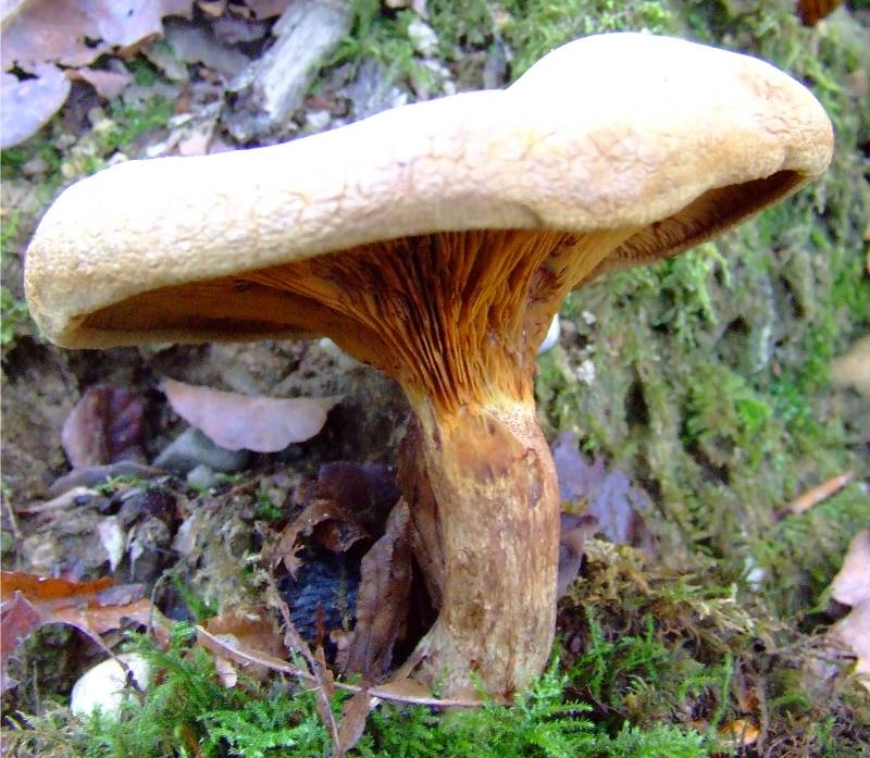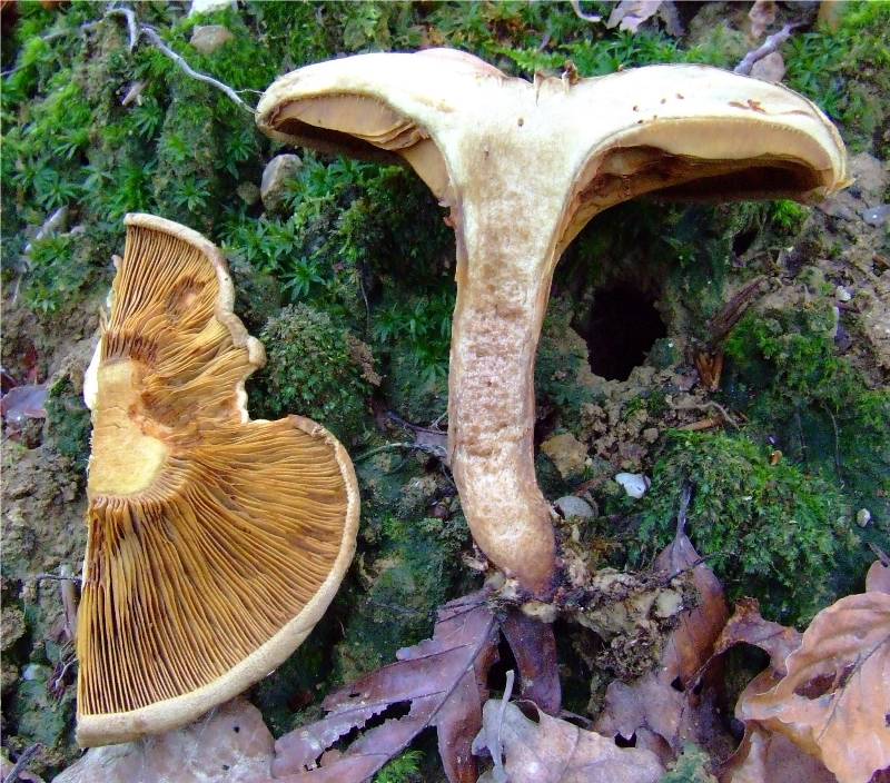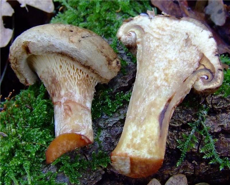 très serrées, décurrentes, fourchues, facilement séparables du chapeau; beiges, puis rouille, devenant brunes au toucher. |