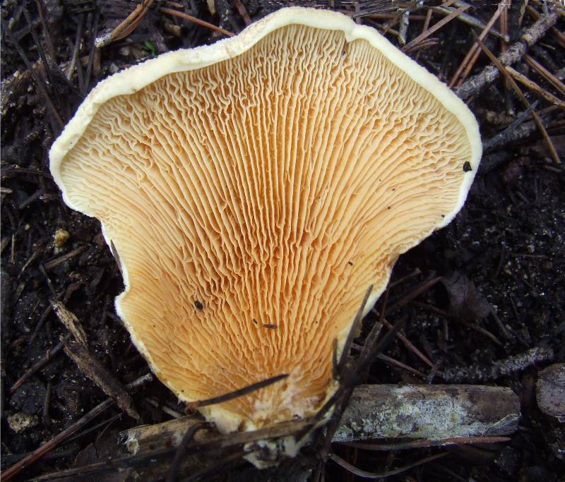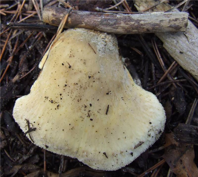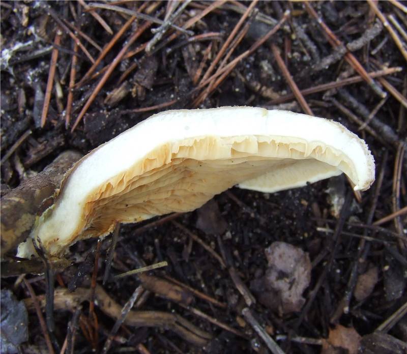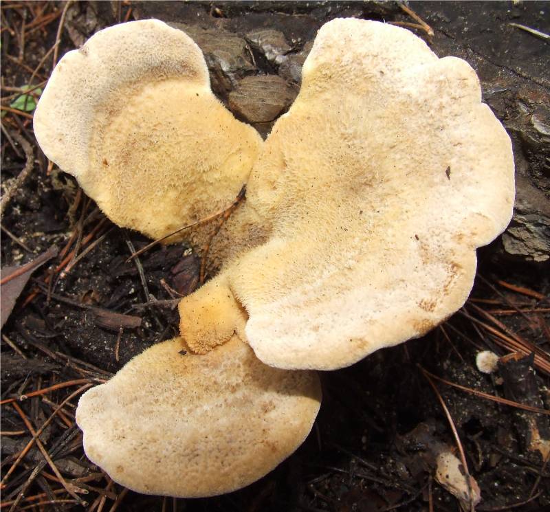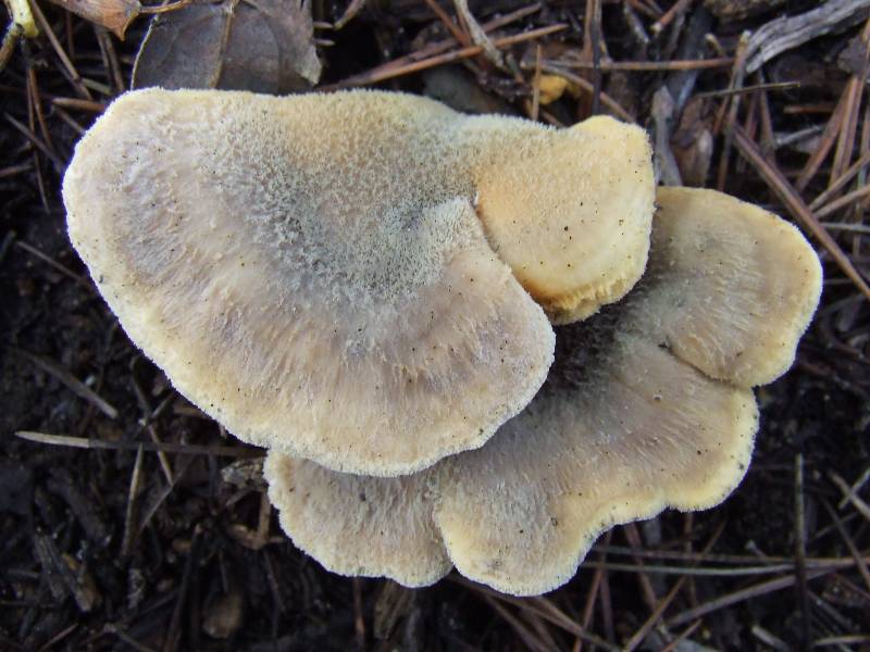 3 à 10 cm, en forme de pleurote ou de panelle, ressemblant à une coquille de forme assymétrique, de couleur ocre, brunissant avec l'âge, la surface est sèche, finement veloutée, la marge est ondulée et enroulée |