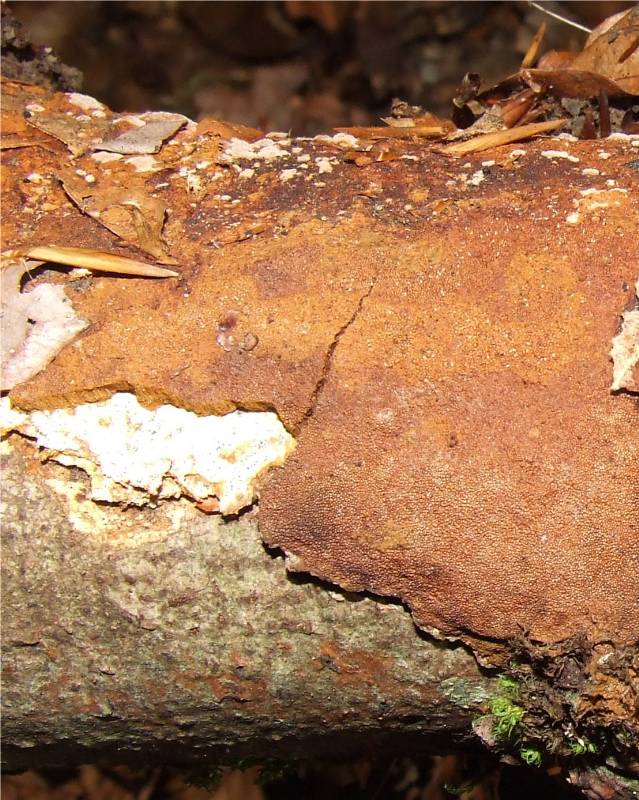 en forme de croûte par endroits bosselée, prenant la forme du support sur lequel il se développe, de couleur brun rouille, la marge se décolle parfois par temps sec |