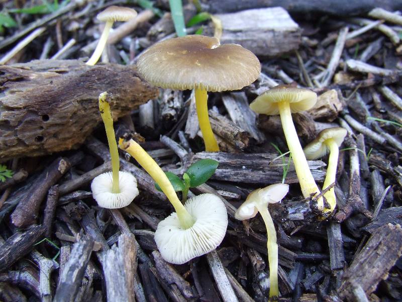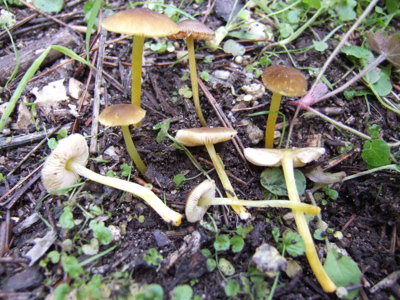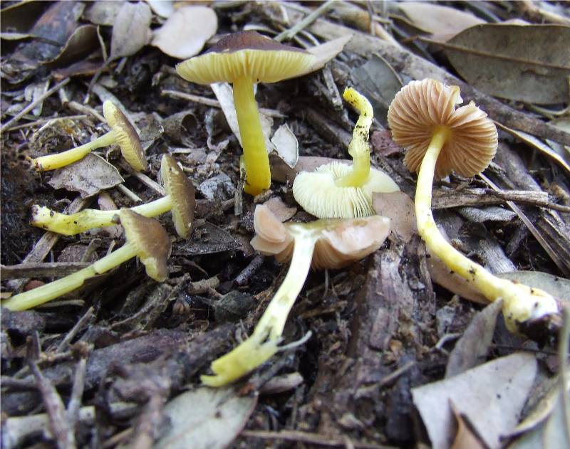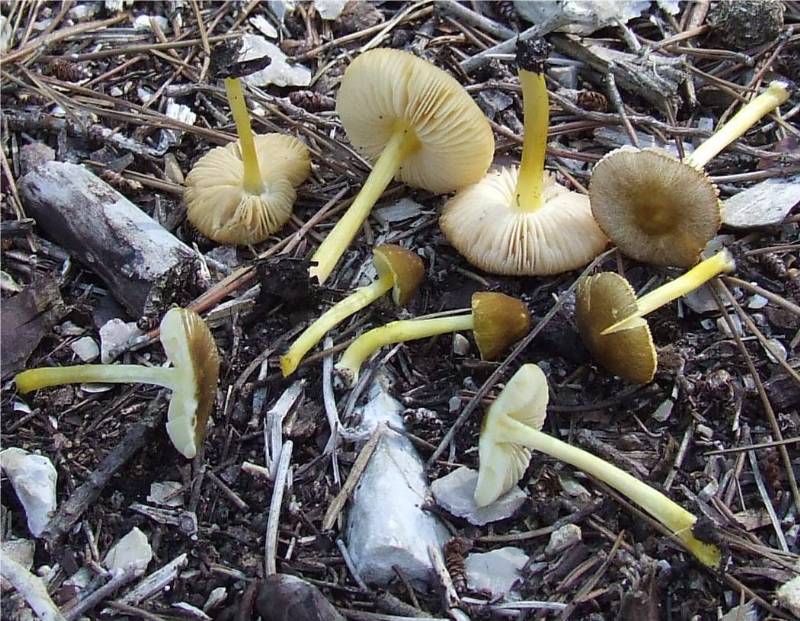 2 à 5 cm de haut et 3 à 4 mm de diamètre, cylindrique, grêle, creux, à surface lisse, jaune translucide presque " fluorescent ". |