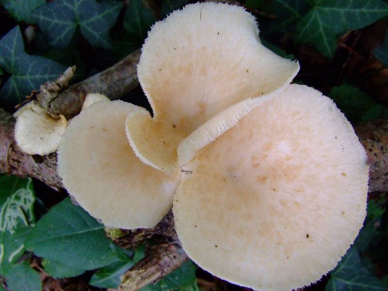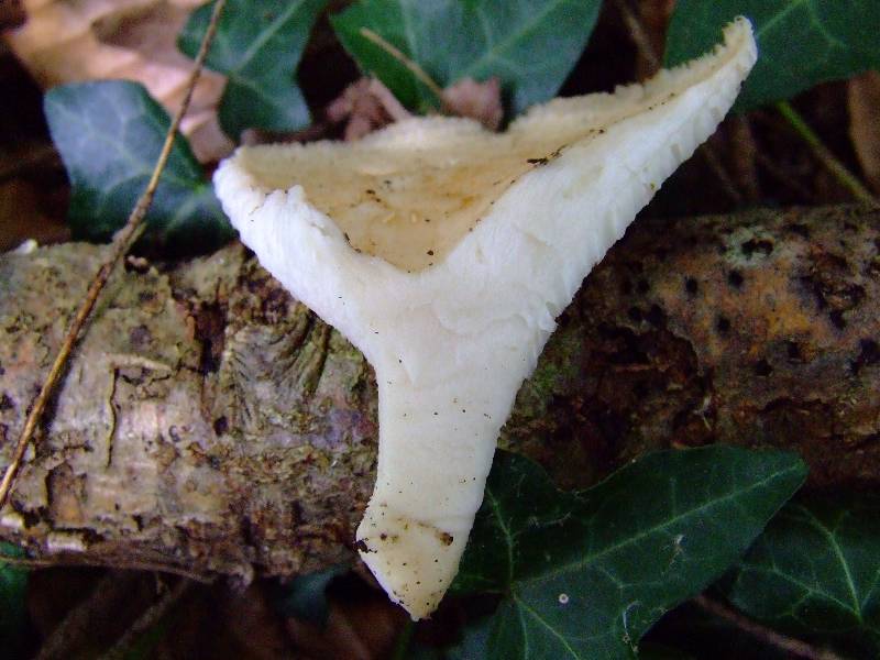 de 3 à 10 cm de diamètre, 0,5 à 1 cm d'épaisseur, plan puis en forme d'entonnoir, marge très mince, régulière au début puis ondulée, de couleur blanche, parsemé de petites écailles crème, le dessous est tapissé de tubes courts, adnés, blancs, jaunissant un peu avec l'âge |