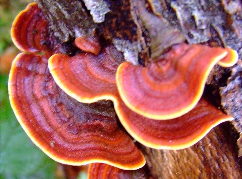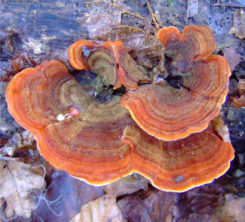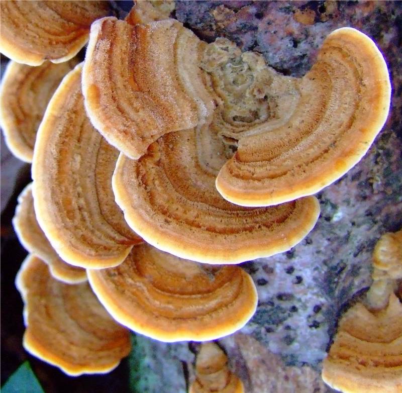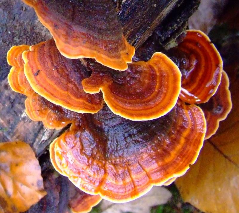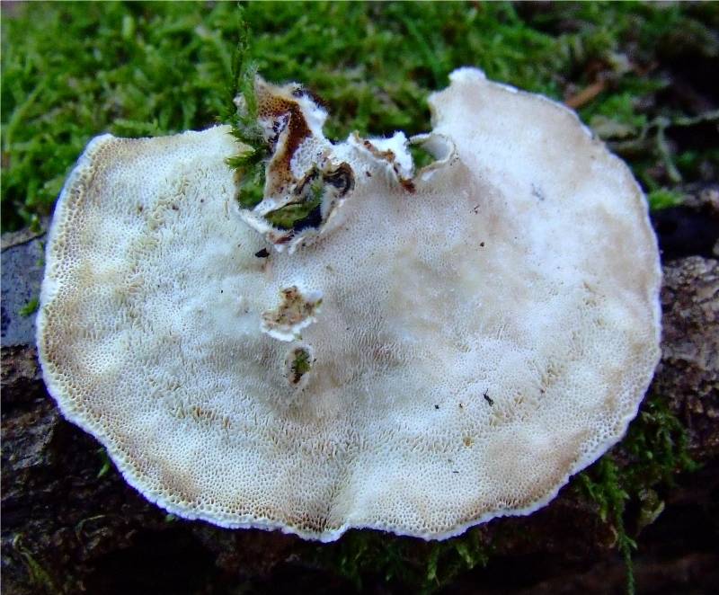 chapeau de 4 à 12 cm, fixé latéralement à son support, sans pied, marge ondulée, couleur variant du beige clair au brun foncé, parfois bleu-gris, orange, rouge.Chapeaux imbriqués, tubes très courts à pores très petits, blancs, jaunissants. |