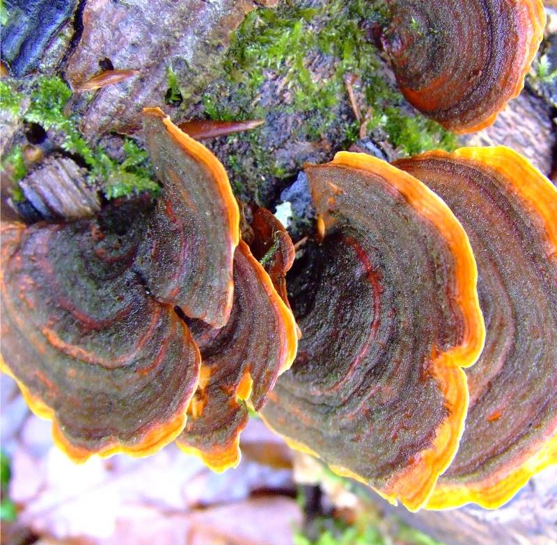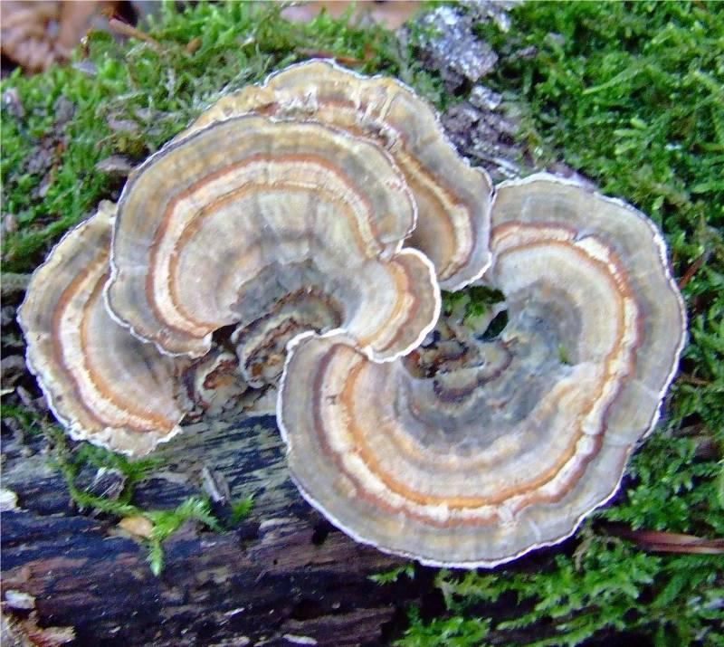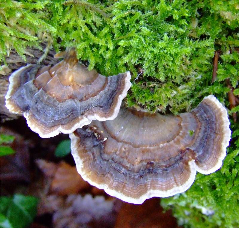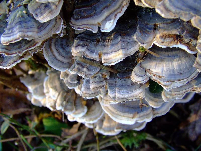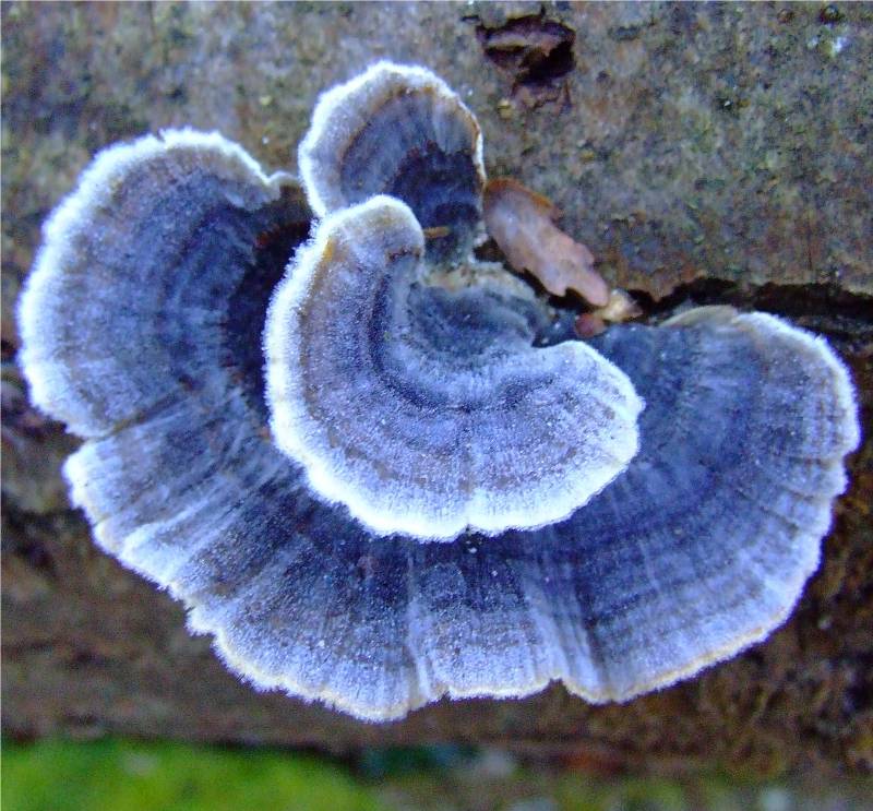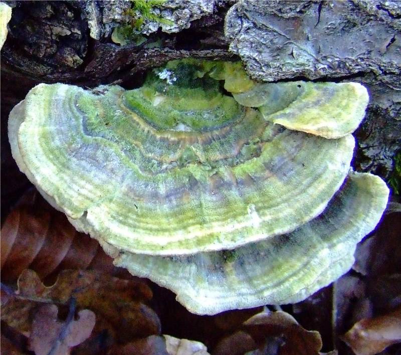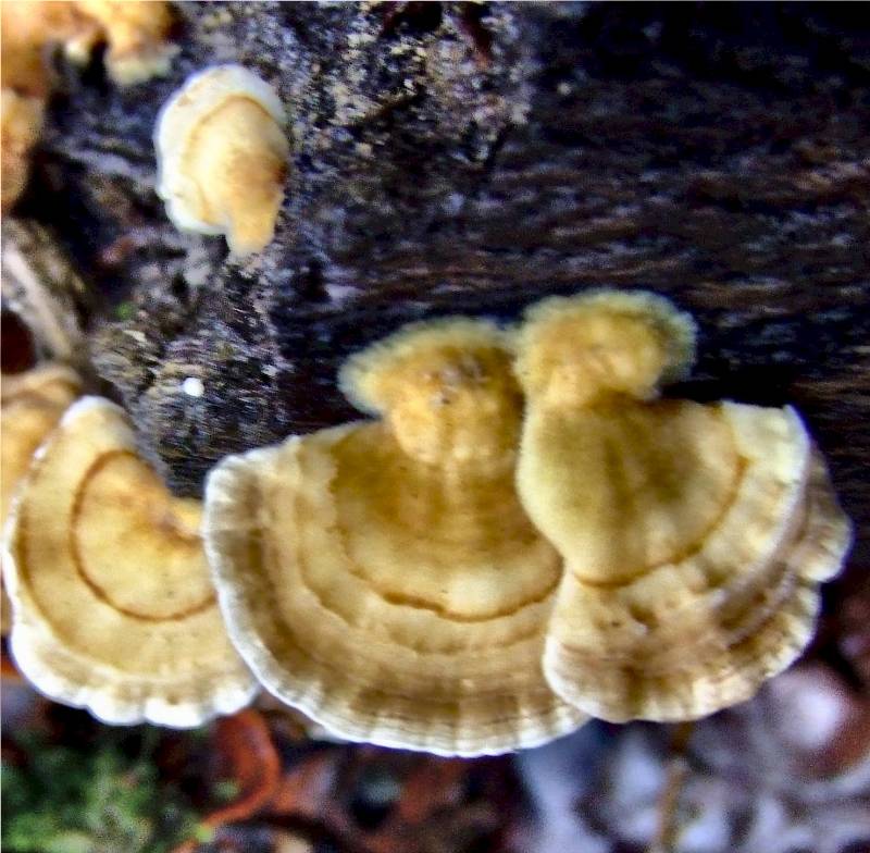 sur bois mort ou vivant de feuillus ( hêtres, bouleaux... ).En groupes..Très courant. persistant toute l'année, même à l'état sec et verdi par les algues ( photo ci dessus ). |