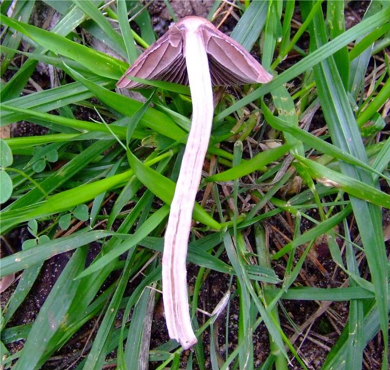 4 à 8 cm de hauteur et 0,3 à 0,5 cm de diamètre, creux, recouvert de fibrilles blanches et pruineuses vers le haut, mais dans les tons violet clair sur toute la longueur. |