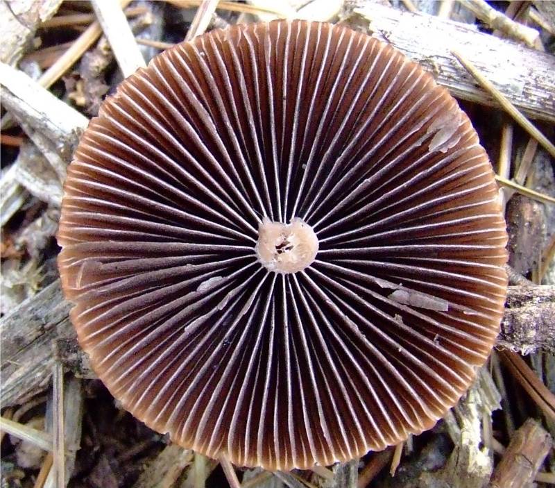 larges 3 - 6 mm, étroite et adnées vers le pied, couleur rose pourpre, devenant brun-gris avec lâge avec l'arrête blanche. |