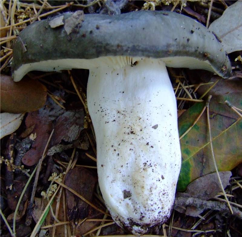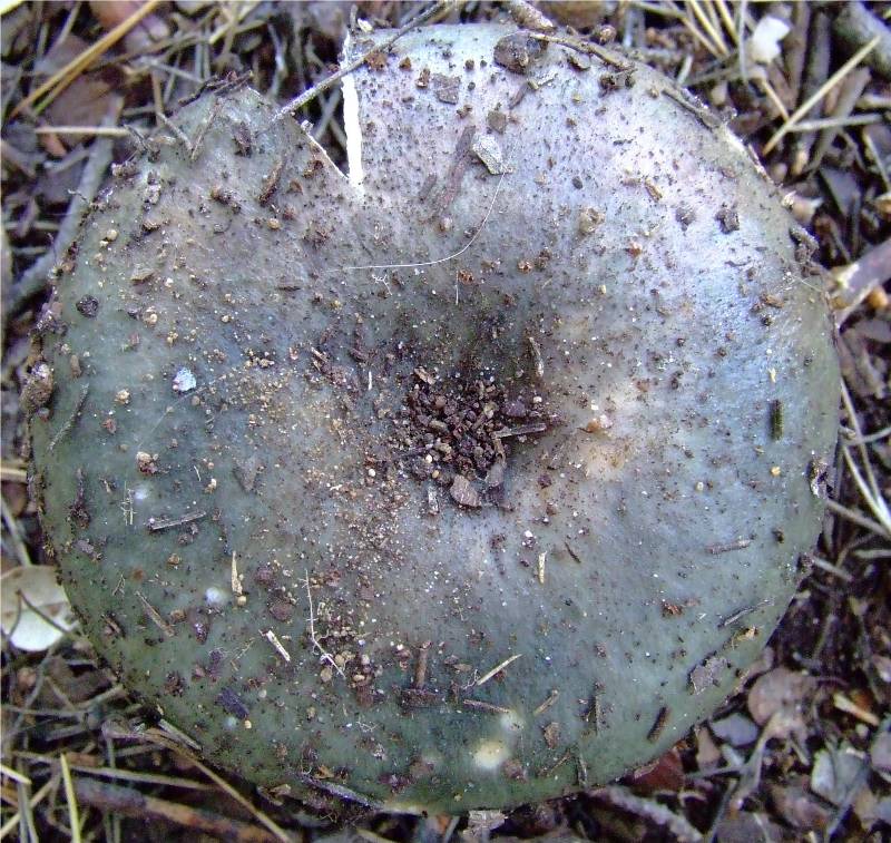 5 à 15 cm de diamètre, charnu, ferme, légèrement creusé en son centre, cette variété de russule charbonnière est dépourvue de pigment violet, le chapeau est donc uniformément vert. |