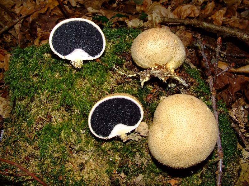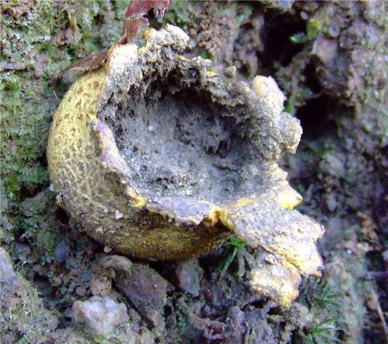 globuleux, de 3 à 15 cm, à sommet aplati, enveloppe externe coriace, crème à orangée, entièrement couverte de verrues pyramidales; rattaché au sol par des filaments courts ressemblant à des racines. |