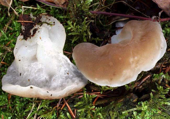 de1 à 8 cm, semi translucide gris-blanc à brun sombre, semi-circulaire, surface duveteuse, fixé latéralement sur les souches. |