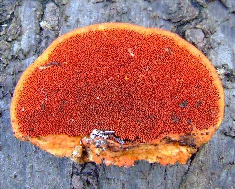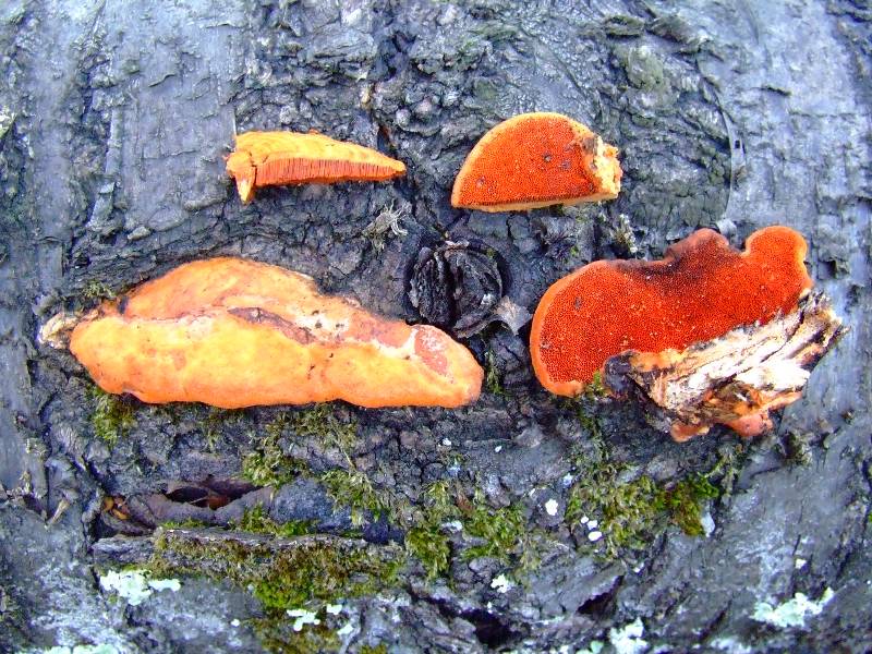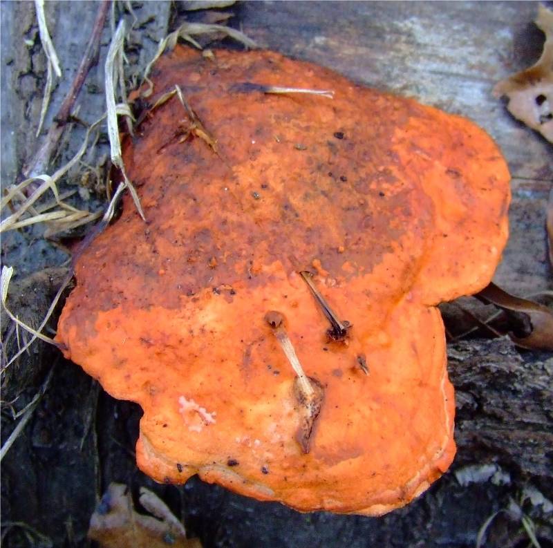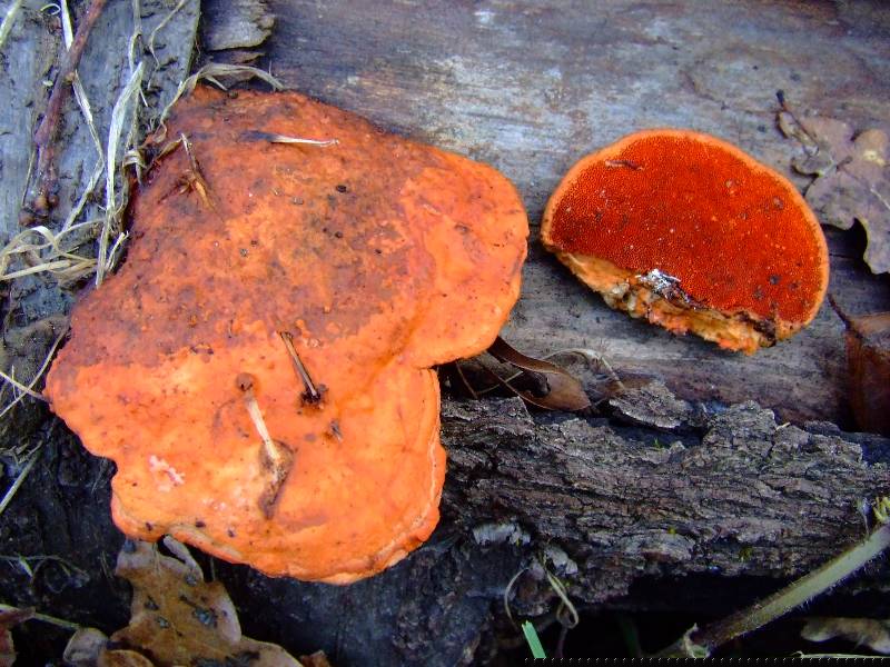 3 à 10 cm de large, 2 à 6 cm de profondeur et 0,5 à 2 cm d'épaisseur, en consoles isolées ou par petits groupes, de couleur orange très vif dans toutes se parties. Surface granuleuse, fibrileuse, légèrement zonnée concentriquement, marge mince et aiguë. |