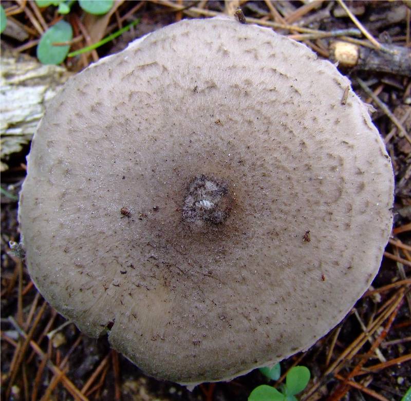 2 à 10 cm de diamètre, convexe à umboné puis plan, couvert de fibrilles ou de petites mèches brunâtres, grises ou gris noirâtre sur fond crème, devenant jaunâtre en " fin de vie ". |