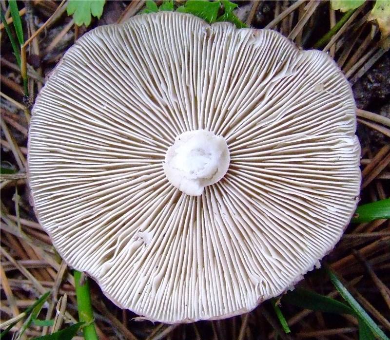 sinuées, échancrées, peu serrées, blanchâtres ou grisâtres très pâle, se tachants de jaune en vieillissant, surtout vers la marge. |