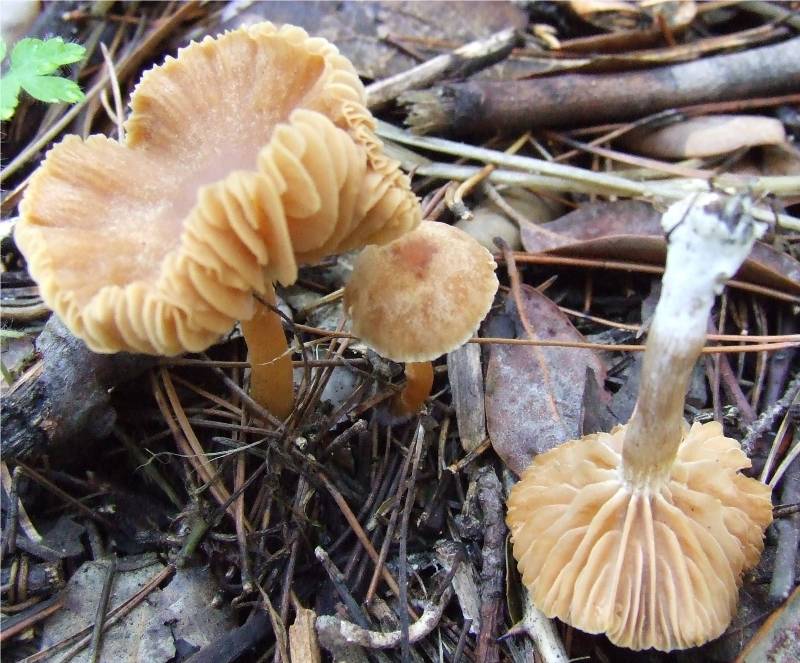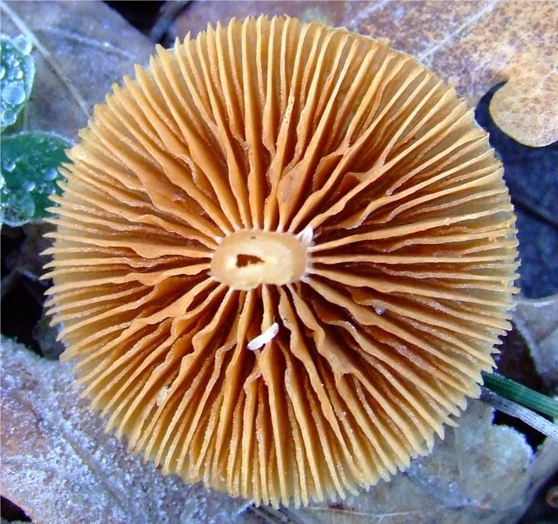 espacées, adnées, légèrement décurrentes, ocre, un peu plus claires que le chapeau. |