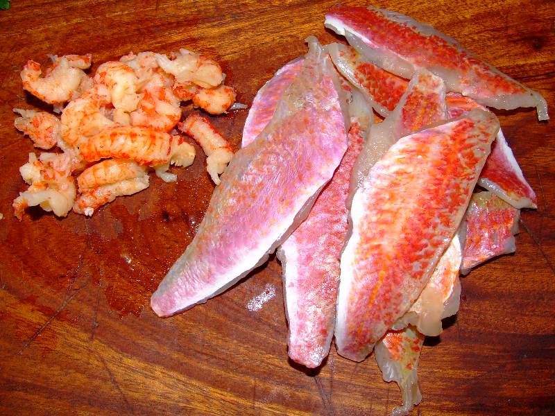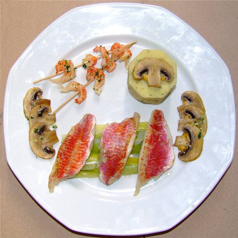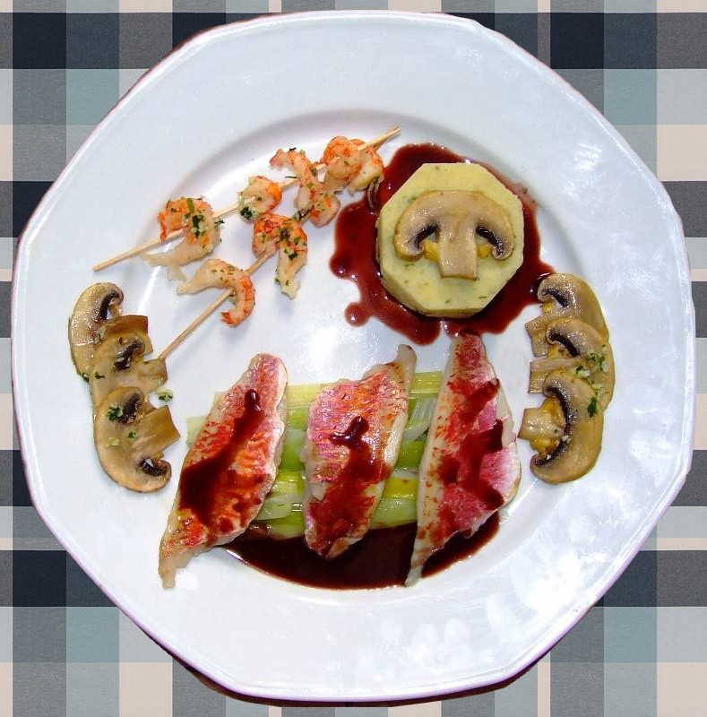 6-pendant ce temps piquer 4 queues d'écrevisses par brochettes, faire un hachis d'ail et de persil, rouler les brochettes dedans et les mettre dans une poêle sur feu moyen contenant 25 gr de beurre pendant une minute de chaque côté,sortir de la poêle et réserver 6-émincer les champignons en lamelles, les mettre dans la poêle à la place des brochettes, les faire dorer des deux cotés, saler poivrer et réserver 7-mettre les filets de rougets dans la poêle côté peau et faire cuire 2 minutes, les retourner et finir de cuire 1 minute hors du feu 8-quand la sauce est à l'état sirupeux la goûter, saler, poivrer si besoin et retirer du feu 9-disposer dans des assiettes bien chaudes un lit de poireau, déposer par dessus 3 filets de rouget, dans le haut de l'assiette, déposer 2 brochettes, la purée moulée dans un cercle, les lamelles de champignons de chaque côtés, napper de sauce les filets et le pourtour de la purée et servir aussitôt |