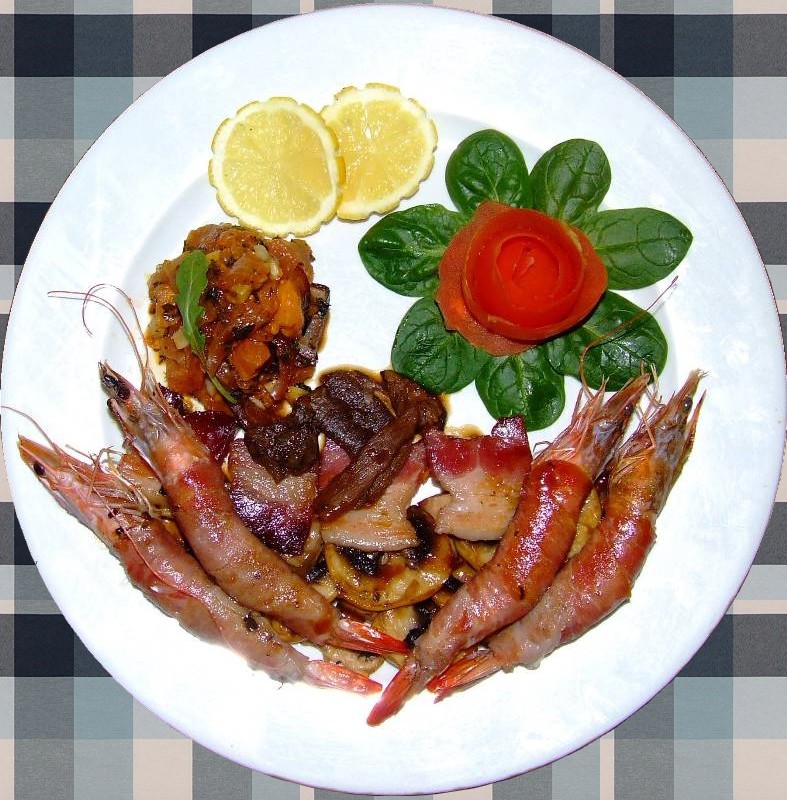 6-sortir les champignons de la poêle les réserver au chaud, mettre à la place les tomates avec un peu d'huile, faire colorer, ajouter la poitrine fumé coupée en lardons, les cèpes trempés et égouttés , l'ail et le basilic haché, saler et poivrer (réserver l'eau de trempage filtrée) 7-dans une seconde poêle anti adhésive, mettre les gambas avec un peu d'huile et faire dorer des deux cotés 8-dans une petite casserole, mettre une cuillère à soupe de maïzena avec l'eau de trempage filtrée et laisser réduire jusqu'à obtention d'une sauce veloutée 9-dans chaque assiette chaude, déposer un petit dôme de tomate, faire un lit de champignons de paris de lardons et de cèpes, déposer dessus 4 gambas et les napper de sauce, décorer avec les pelures de tomates roulées et les pousses de jeunes épinard pour former des fleurs et des rondelles de citron vin conseillé: Rosé de Provence bien fruité |