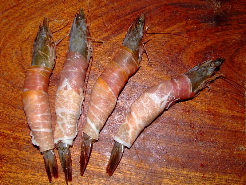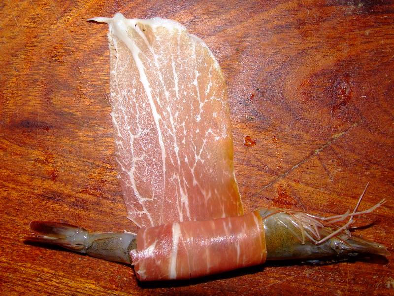 1-faire tremper les cèpes dans un bol d'eau chaude pendant 30 minutes 2-pendant ce temps, décortiquer les gambas en prenant soin de conserver la tête et l'extrémité de la queue 3-couper les tranches de jambon dans le sens de la longueur, déposer au bas de chaque tranches une gambas et rouler pour enrober la partie de la queue décortiquée, réserver au frais 4-couper les champignons de paris en lamelles épaisses, les faire dorer dans une poêle avec un peu de beurre, saler et poivrer 5-pendant ce temps, éplucher les tomates à l'aide d'un économe, réserver les pelures pour la décoration, couper les tomates en 4 puis en petits dés