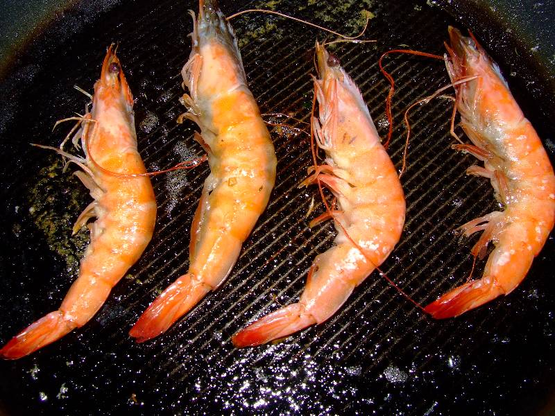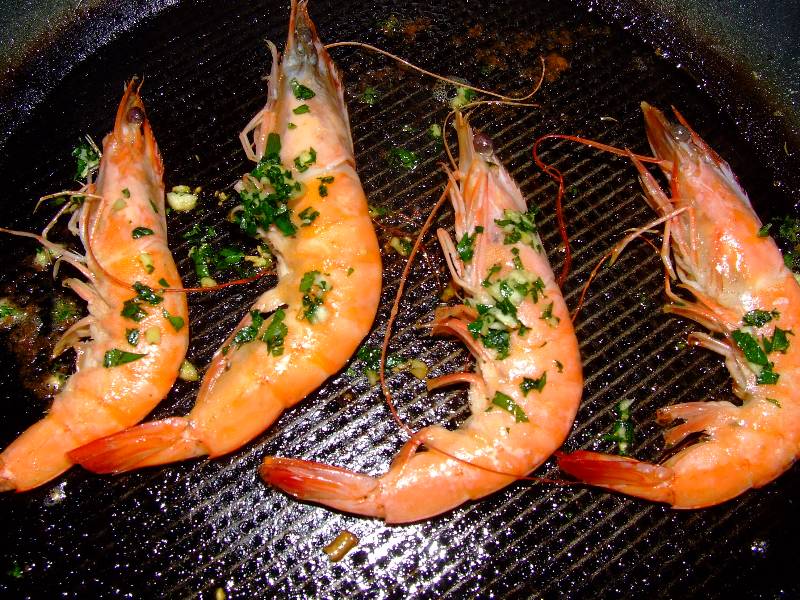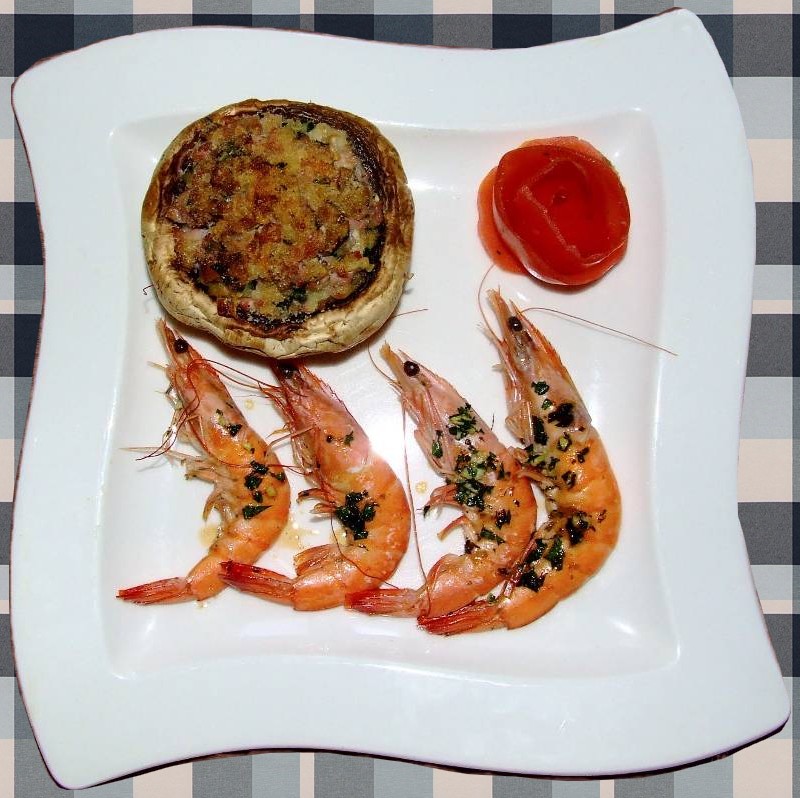 5-pendant ce temps, éplucher avec un couteau très aiguisé les tomates, de la même façon qu'une pomme en longeant au plus près la chair (garder la chair pour une autre utilisation), puis enrouler chaque bande de peau de tomate en spirale de façon à obtenir une rose 6-5 minutes avant la fin de cuisson des chapeaux farcis, faire cuire les gambas dans une poêle avec de l'huile, arroser d'armagnac, faire flamber, saler, poivrer, saupoudrer d'ail et de persil haché bien mélanger 7-dans des assiettes chaudes, aligner 4 gambas, 1 chapeau de champignon farci, et décorer avec une rose de tomate, servir aussitôt