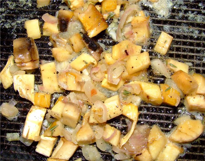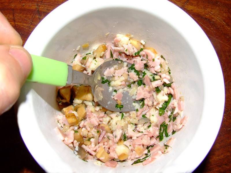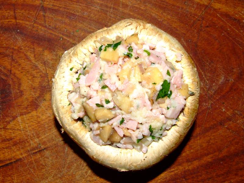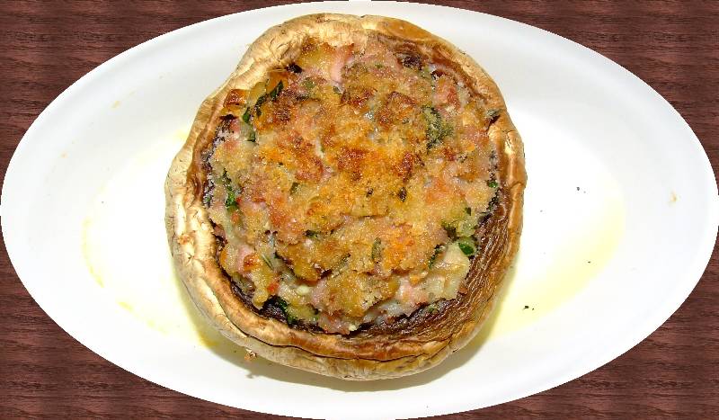 1-mettre dans une tasse la mie de pain à tremper dans du lait 2-détacher les pieds de chaque champignon et les hacher grossièrement, hacher également les échalotes et faire dorer le tout dans une poêle avec du beurre, saler, poivrer, saupoudrer de thym émietté 3-dans un petit récipient, mettre la mie de pain essorée pour éliminer le surplus de lait, ajouter le jambon haché, 1 gousse d'ail, la moitié du persil, ajouter les pieds de champignons et l'échalote et bien mélanger le tout 4-farcir chaque chapeau de champignon avec le mélange ainsi obtenu, saupoudrer de chapelure et déposer dessus une noix de beurre, mettre les champignons dans un plat à gratin beurré et enfourner à 200° pendant 15 minutes |