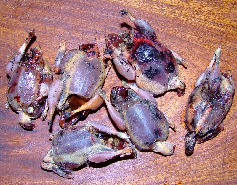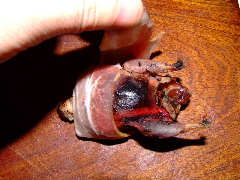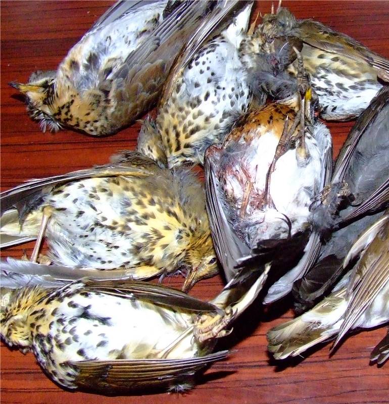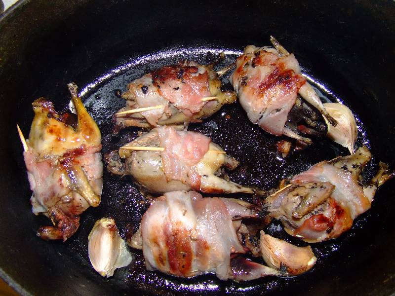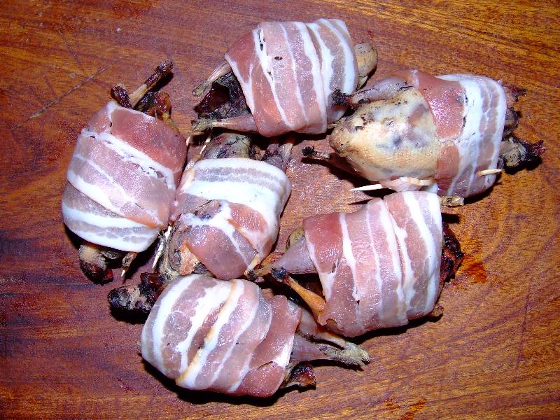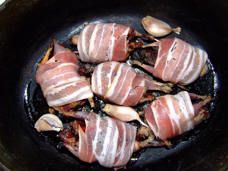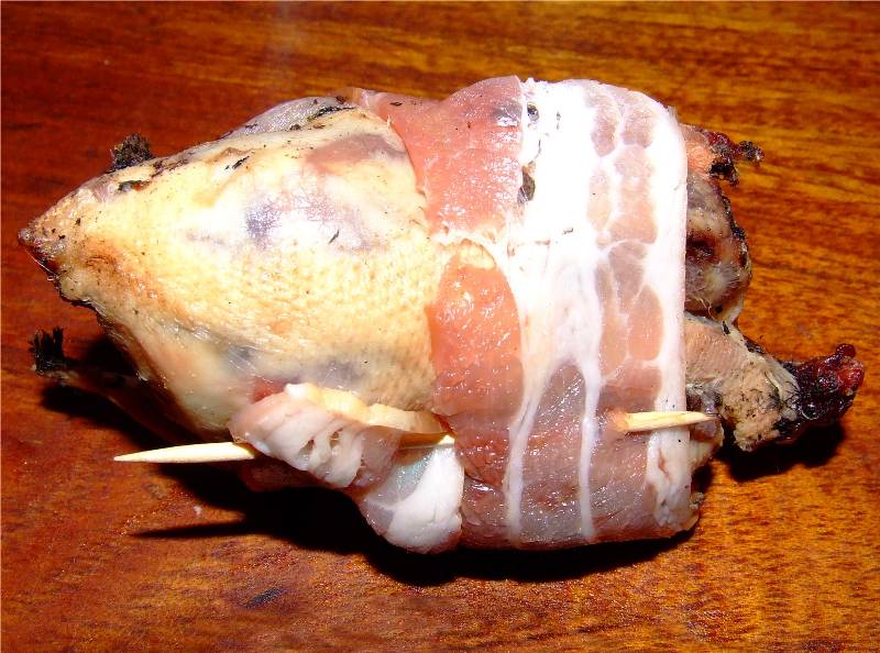 1-pour trois personnes plumer, vider (selon le goût vous pouvez ne pas vider les grives), flamber les grives 2-enrouler chaque grives d'une tranche de lard et maintenir celle ci à l'aide d'un cure dent piqué dans le dos 3-mettre les grives et les gousses d'ail dans une cocotte en fonte avec un peu d'huile sur feu vif, faire dorer sur chaque faces, puis réduire à feu doux, saler, mettre un brin de thym et de romarin et laisser cuire une heure à couvert 4-pendant ce temps faire tremper les trompettes des morts dans un bol d'eau tiède, mettre les pommes de terre sans les peler dans une casserole d'eau bouillante salée et faire cuire une trentaine de minutes vin conseillé: Gigondas rouge |
