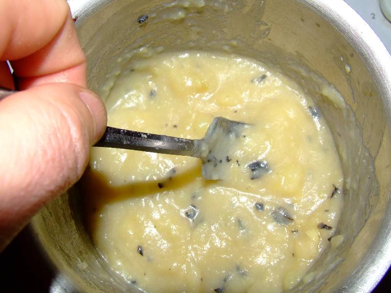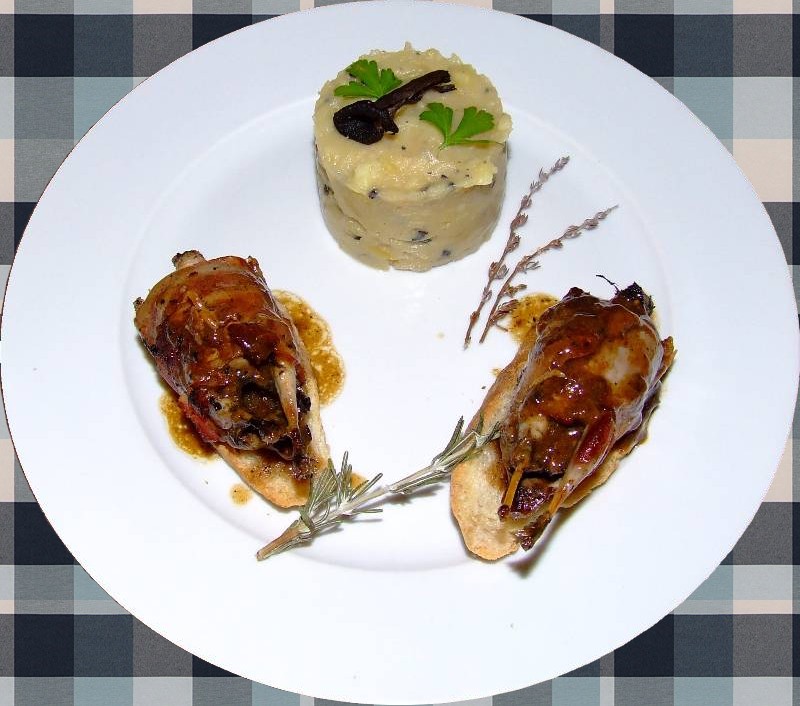 5-au bout de 30 minutes, sortir les pommes de terre les passer sous l'eau froide et les peler 6-dans une petite casserole, mettre les pommes de terre coupées en morceaux, le lait, les champignons hachés et l'eau de trempage filtrée, faire cuire sur feu doux jusqu'à évaporation totale du liquide, saler, poivrer, ajouter une noix de beurre, écraser grossièrement à la fourchette, bien mélanger le tout et réserver au chaud 7-couper 6 tranches de pain et les faire griller légèrement 8-disposer dans chaque assiette deux tranches de pain grillé, déposer les grives par dessus, de la purée à coté, déglacer le fond de la cocotte avec un peu d'eau chaude et gratter les sucs de cuisson, arroser les grives et la purée avec le jus obtenu et servir aussitôt |