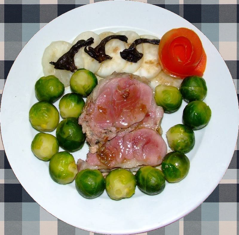 6-dans une cocotte en fonte, mettre un peu d'huile et y mettre le jarret à dorer sur feu doux sur toute ses faces, verser dessus l'eau de trempage des champignons filtrée et faire cuire à couvert sur feu moyen pendant 1 heure 30 7-au bout de ce temps, enlever le couvercle, mettre les champignons restants et finir de cuire à découvert pendant 30 minutes 8-mettre dans une grande casserole d'eau salée bouillante, les navets épluchés et les choux de Bruxelles triés et nettoyés, éplucher les tomates comme des pommes le plus finement possible et enrouler la pelure pour former des "fleurs" 9-sortir le jarret de la cocotte, ajouter une cuillère à soupe de maïzena et laisser réduire la sauce 10-couper le jarret en tranches épaisses, déposer une tranche dans chaque assiette, entourer avec les choux et des rondelles de navets, décorer avec les trompettes et des "fleurs" en tomates et napper de sauce |