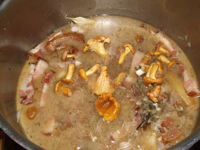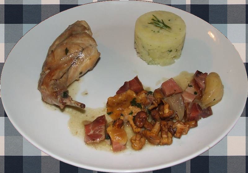 5-pendant ce temps nettoyer soigneusement les girolles, couper les plus grosses en deux si nécessaire, éplucher les pommes de terre 6-au bout de 45 minutes, mettre les pommes de terre dans une casserole d'eau bouillante salée et faire cuire 20 minutes à la reprise de l'ébullition 7-ajouter les girolles dans la cocotte et prolonger la cuisson 15 minutes 8-en fin de cuisson, laisser réduire la sauce si nécessaire, rectifier l'assaisonnement en poivre et sel si besoin 8-dans chaque assiette, servir les morceaux de lapin avec une écrasée de pommes de terre persillée, accompagner avec les girolles, les dés de jambon et la poitrine fumée, napper de sauce et servir aussitôt |