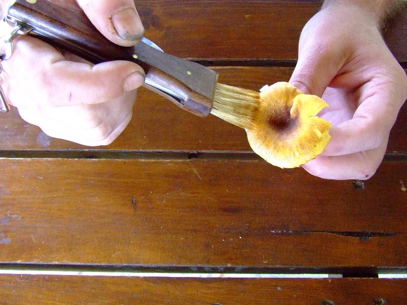 Avec un petit couteau aiguisé, ôtez soigneusement les impuretés sur le pied, dont vous couperez l'extrémité ( cependant si vous êtes sûr de la comestibilité d'un champignon, et n'avez pas besoin de conserver la base du pied pour confirmer son identification, il est recommander de couper celle ci sur place au cours de la cueillette, ce qui évitera de souiller les autres champignons avec de la terre ou des débris de végétaux ). Essuyez délicatement chapeau et pieds, apportez un soin tout particulier à ceux qui sont formés de replis d'aiguillons et de cavités (girolles, pieds de mouton, morilles...) il est conseillé de parfaire le nettoyage de ces derniers à l'aide d'un pinceau