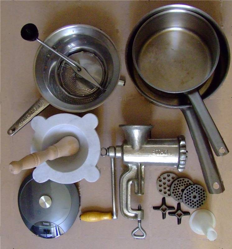 1:moulin à légumes | 2:casseroles Ø 20 et 24 | 3:mortier et pilon |