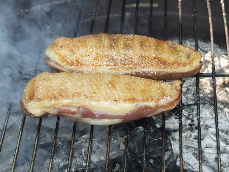 1-pour 2 personnes, trier et nettoyer les girolles, couper les plus grosses si nécessaire 2-prendre les magrets et les inciser côté peau à l'aide d'un couteau 3-déposer les magrets coté peau sur une grille au dessus de braises, faire cuire pendant 10 minutes 4-faire cuire les girolles dans une poêle avec la graisse de canard |