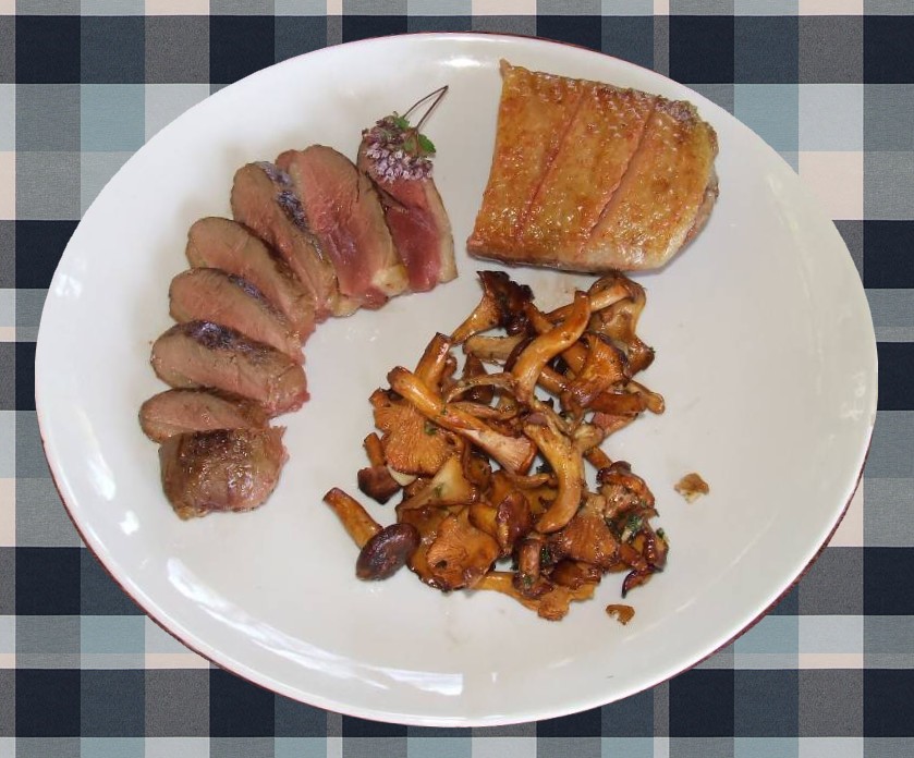 5-retourner les magrets, saler, poivrer, parsemer de thym et prolonger la cuisson 5 minutes 6-saupoudrer les girolles avec de l'ail et du persil haché, saler, poivrer, bien mélanger 7-retirer les magrets du grill (si nécessaire et selon le goût prolonger la cuisson), prétrancher les magrets 8-déposer dans chaque assiette un magret accompagné de girolles et servir aussitôt vin conseillé: Madiran rouge |