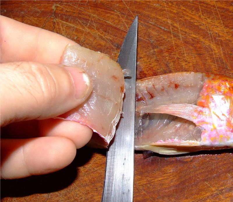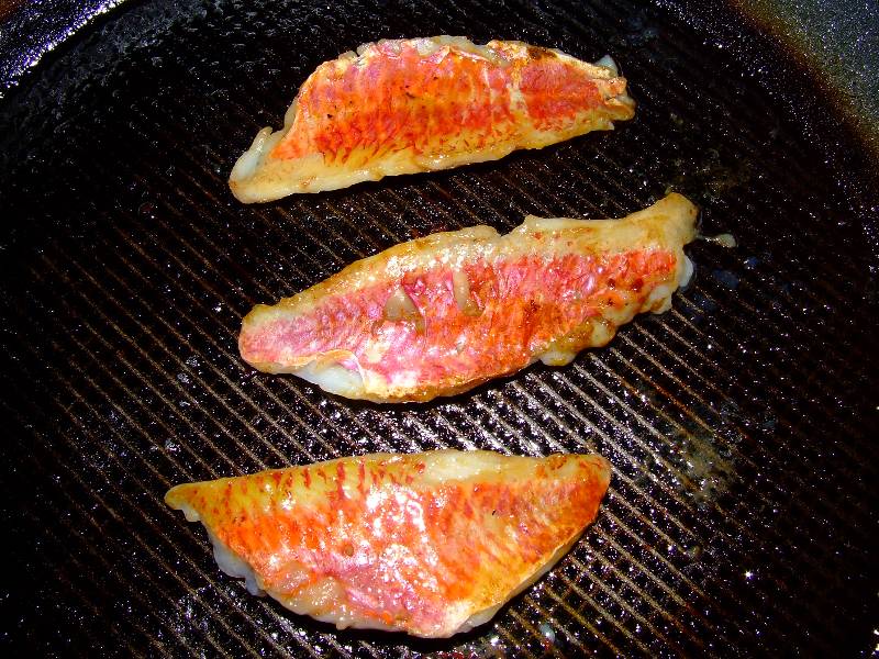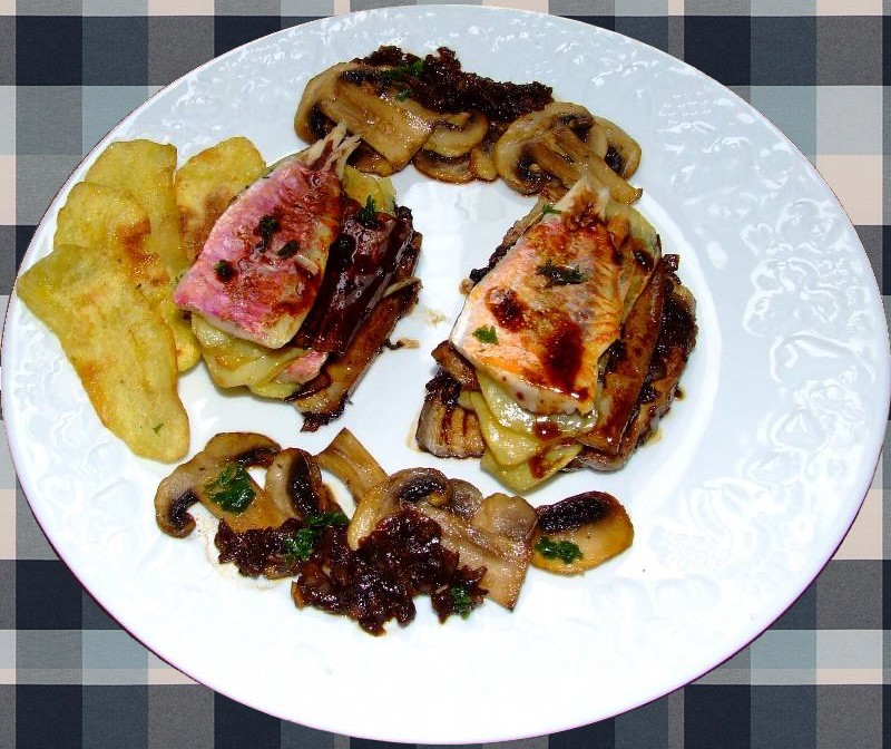 1-pour deux personnes: prendre les rougets les écailler, poser un rouget à plat, le maintenir en posant une main dessus, de l'autre main planter un couteau fin et aiguisé dans le dos à la base de la tête et longer le long de l'arête centrale jusqu'à la queue et détacher le filet, retourner le poisson et répéter la même opération mais cette fois en taillant avec le couteau à la base de la queue et remonter le long de l'arête jusqu'à la tête, vérifier s'il ne reste pas d'arêtes auquel cas les retirer à l'aide d'une pince à épiler ou avec les ongles, réserver au frais 2-éplucher les pommes de terre, les rincer, les couper en fines tranches, les faire dorer des deux côtés dans une poêle avec un peu de beurre sur feu moyen, saler et réserver 3-trier et nettoyer les champignons, les couper en lamelles, les mettre dans la poêle ayant servie à faire cuire les pommes de terre, ajouter un peu d'huile, bien faire dorer les champignons, les saler, bien remuer et réserver |