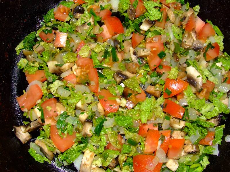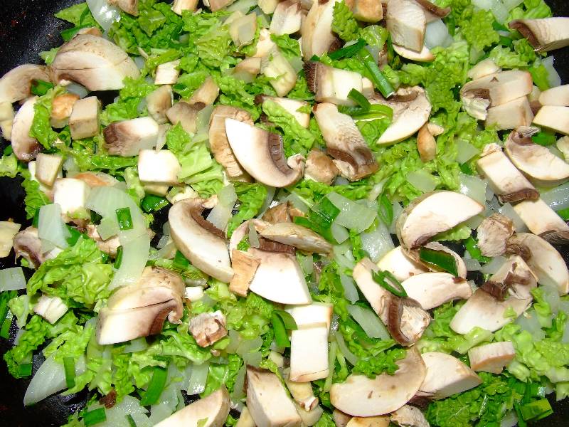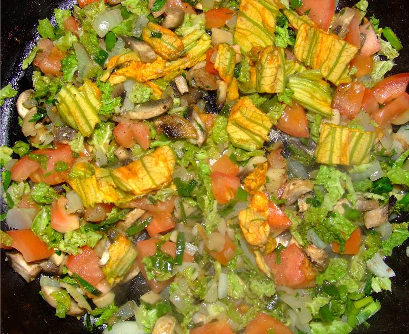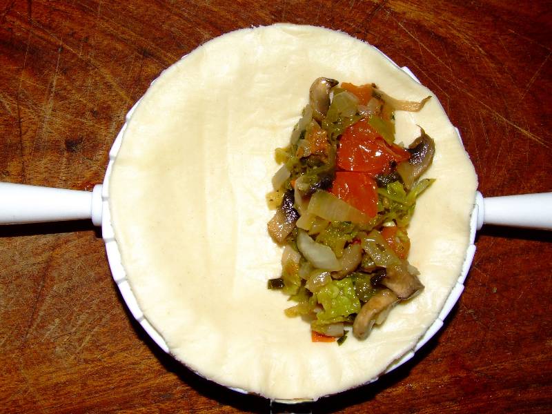 1-hacher grossièrement au couteau le chou, le vert de poireau, l'oignon, 2 champignons, les mettre dans une poêle avec 4 cuillères à soupe d'huile d'olive du thym émietté et faire sauter à feu vif pendant 5 minutes en remuant sans cesse 2-ajouter les tomates mondées, baisser le feu et laisser cuire encore 10 minutes, découper les fleurs de courgette en petits tronçons les mettre dans la poêle avec l'ail et le persil haché, saler poivrer, bien mélanger le tout pendant une minute, retirer du feu et laisser refroidir 3-dérouler la pâte, découper des ronds de 12 cm de diamètre environ, déposer sur la moitié de chaque rond de la garniture refroidie, replier la pâte pour former des demie lunes |