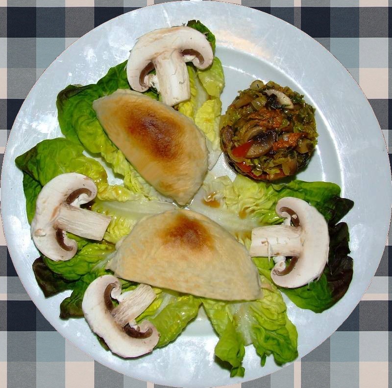 4-mettre les minis chaussons ainsi obtenus sur une plaque et enfourner à 180° pendant 20 à 30 minutes 5-pendant ce temps, laver, essorer et trier la salade, découper les champignons restant en fines lamelles 6-sortir les chaussons et les laisser tiédir, dans des assiettes mettre un peu de garniture formée à l'aide d'un cercle, faire un lit avec des feuilles de salade, déposer dessus les chaussons, entourer de quelques lamelles de champignons, arroser d'un filet d'huile d'olive et d'un trait de vinaigre de xérès