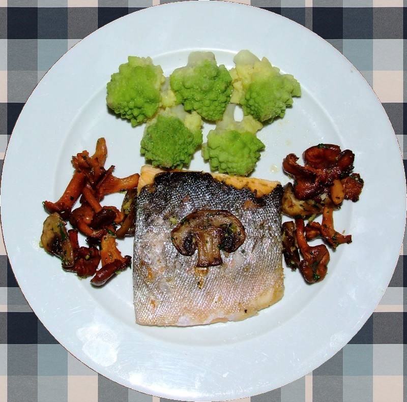 4-dans une seconde poêle contenant l'huile, mettre les filets de poisson côté peau pendant 3 minutes, saler, retourner, saler l'autre côté et prolonger la cuisson 2 minutes 5-égouter le chou et réserver, saler et poivrer les champignons, saupoudrer d'ail et de persil haché bien mélanger et retirer la poêle du feu 6-dans des assiettes chaudes, déposer au centre 1 filet de poisson, entourer avec les champignons ajouter les bouquets de chou avec une noix de beurre vin conseillé: Cassis blanc |