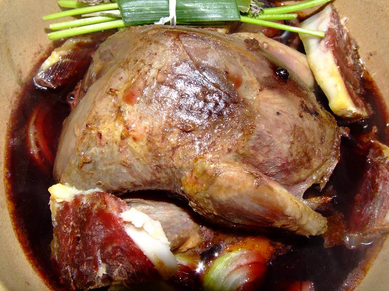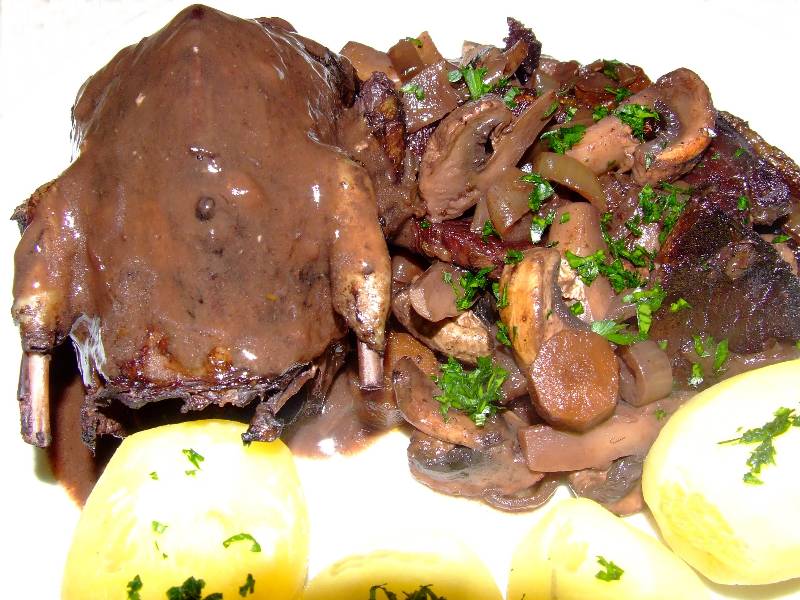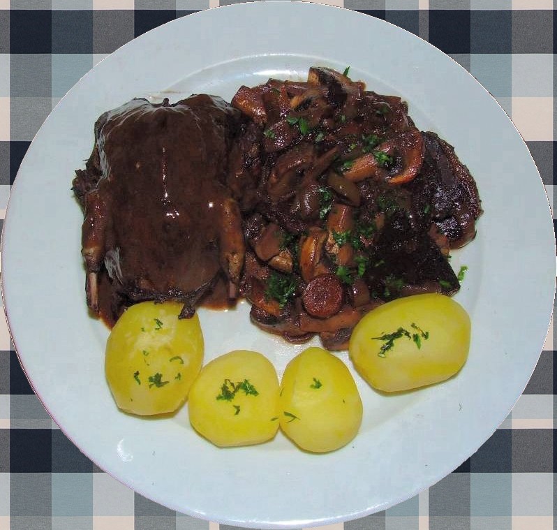 5-au bout d'une demi heure, retirer la palombe et la reserver au chaud, mettre les champignons coupés en quartiers et laisser cuire la sauce 20 minutes 6-pendant ce temps, mettre dans une casserole d'eau bouillante salée, les pommes de terre non pelées pendant 20 minutes également 7-au bout de 20 minutes, égouter les pommes de terre, les peler et reserver, retirer le bouquet garni lier la sauce avec la farine poivrer et laisser réduire jusqu'à obtention d'une belle sauce bien veloutée 8-disposer dans une assiette la palombe, à coté les champignons avec les tranches de jambon, carottes et oignons, napper le tout avec la sauce, saupoudrer de persil ciselé et accompagner avec les pommes de terre vin conseillé: Madiran rouge |