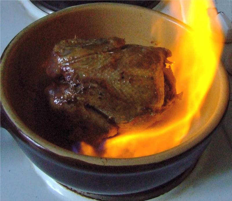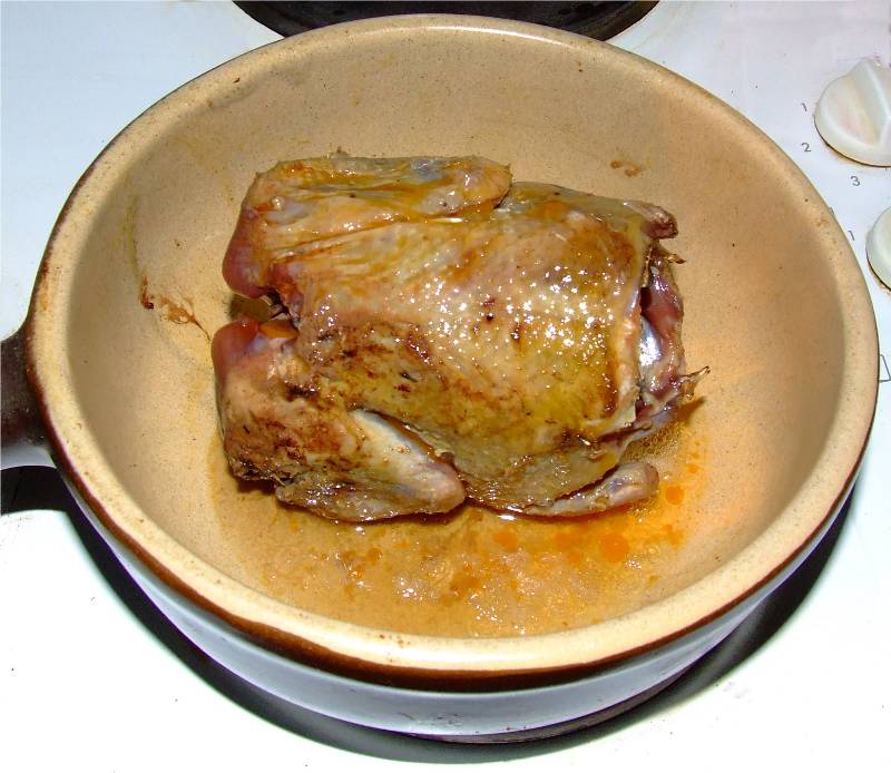 1-pour une personne: dans une petite casserole mettre le vin rouge sur feu vif et le faire flamber pour évaporer l'alcool, enlever le gras du talon de jambon et le faire fondre dans un petit poëlon en terre ou en fonte 2-retirer le bout de gras non fondu et mettre la palombe à dorer sur toute ses faces, pendant ce temps éplucher l'oignon et la carotte 3-quand la palombe est dorée sur toute ses faces, la saler, l'arroser d'armagnac et faire flamber, couper la carotte et l'oignon en rondelles, le jambon en petites tranches épaisses 4-verser le vin sur la palombe, ajouter la carotte, l'oignon, le jambon, la gousse d'ail les baies de genièvre et le bouquet garni, faire cuire à découvert sur feu moyen pendant une demi heure |