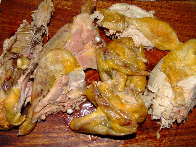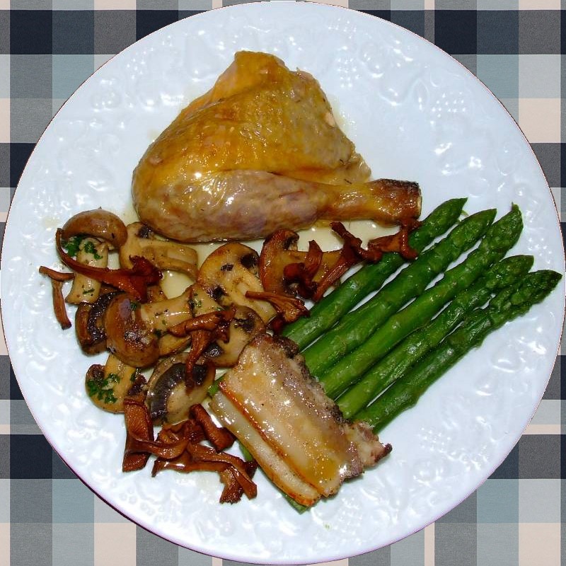 5-au bout de 30 minutes de cuisson du pintadeau mettre dans le plat les tranches de poitrine fumée et continuer la cuisson 6-mettre dans une poêle un peu de beurre, et y faire dorer les champignons, quand ils sont bien colorés, les saler, les parsemer d'ail et de persil haché, bien mélanger et réserver 7-plonger dans une casserole d'eau bouillante salée les asperges, les faire cuire à frémissement pendant 10 minutes, les égoutter et réserver 8-ajouter la maïzena, dans la sauce, mélanger, si nécessaire rectifier l'assaisonnement, faire réduire si la sauce est trop liquide rajouter un peu d'eau chaude si elle est trop épaisse 9-sortir le pintadeau, le découper, servir un morceau dans chaque assiette, accompagner avec les asperges, la poitrine fumée et les champignons de paris, napper de sauce et servir aussitôt |