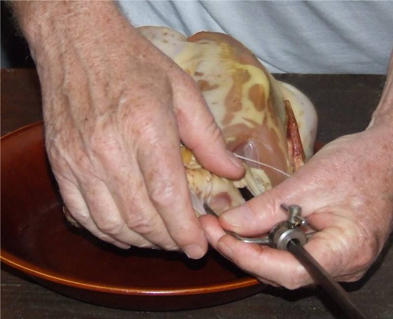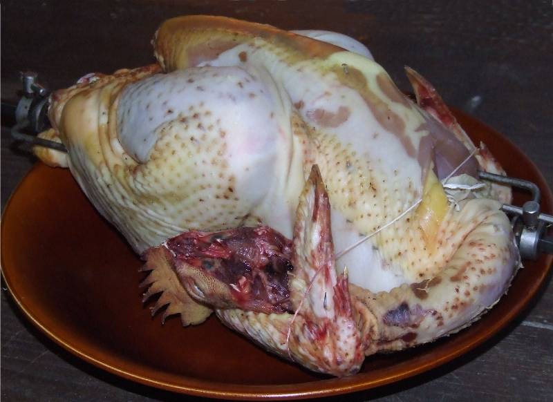 1-pour 8 personnes environ, plumer, flamber, vider le poulet, récupérer le foie, le coeur et le gésier (fendre le gésier transversalement, enlever les petits cailloux à l'intérieur, retirer la peau interne et bien rincer) 2-remettre à l'intérieur du poulet