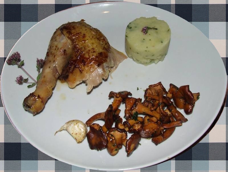 5-une demie heure avant la fin de cuisson du poulet, mettre les pommes de terre épluchées dans une grosse casserole d'eau bouillante salée et faire cuire 30 minutes 6-pendant ce temps, trier les champignons et les néttouyer soigneusement, couper les plus gros si nécéssaire 7-égoutter les pommes de terre, les écraser et y ajouter un peu d'ail et de persil haché et du jus de poulet pris dans la lèchefrites et réserver 8-dans une grande poêle, faire sauter dans un peu de jus de poulet les champignons, les saler, y ajouter en fin de cuisson un peu d'ail et de persil haché 9-déposer dans chaque assiette un morceau de poulet accompagné de champignons et d'écrasée de pomme de terre, arroser de jus de cuisson et servir aussitôt |