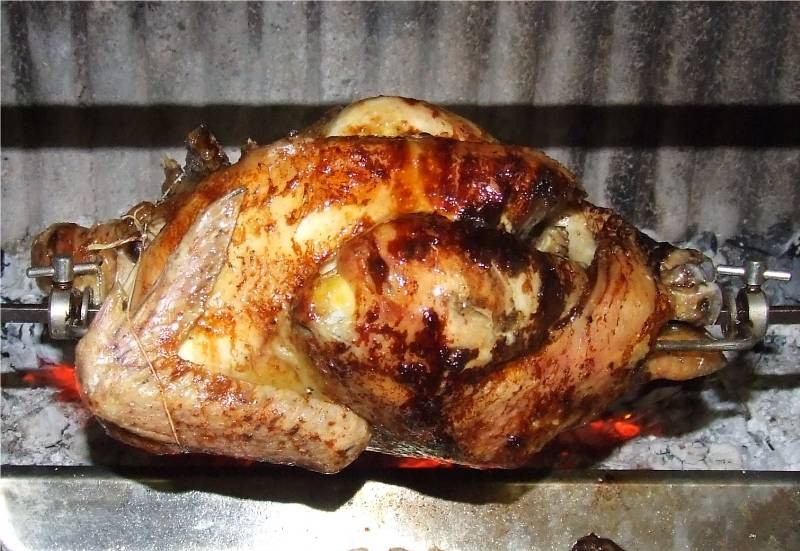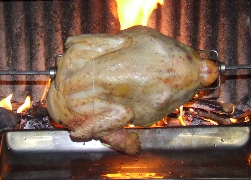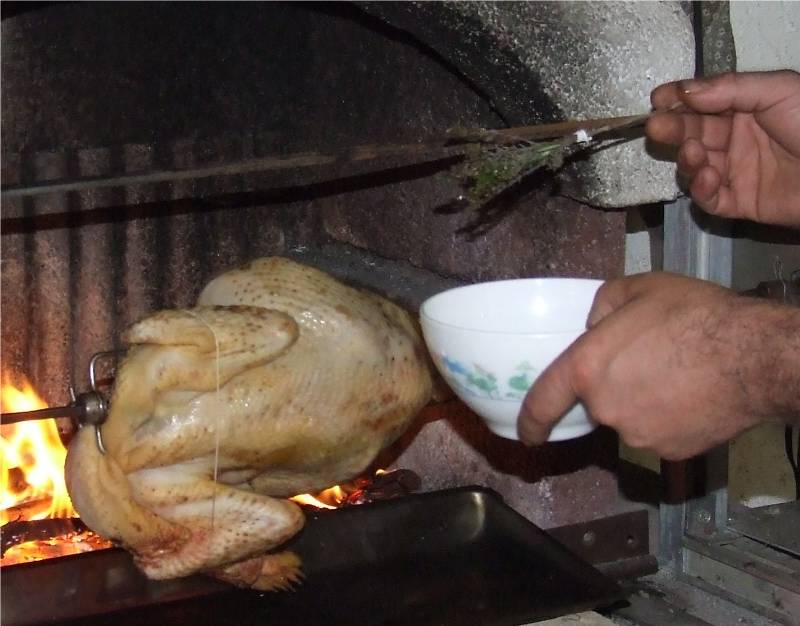 l'intérieur, ficeler et embrocher 3-installer le tourne broche au bord du feu de bois que vous aurez préalablement préparé, mettre une lèchefrites sous le poulet 4-dans un bol mélanger l'huile, du sel, du poivre et badigeonner le poulet avec ce mélange à l'aide d'une branche de thym tout au long de la cuisson qui doit durer de 1h30 à 2h00 selon la taille du poulet vin conseillé: Madiran rouge |
