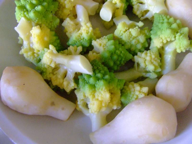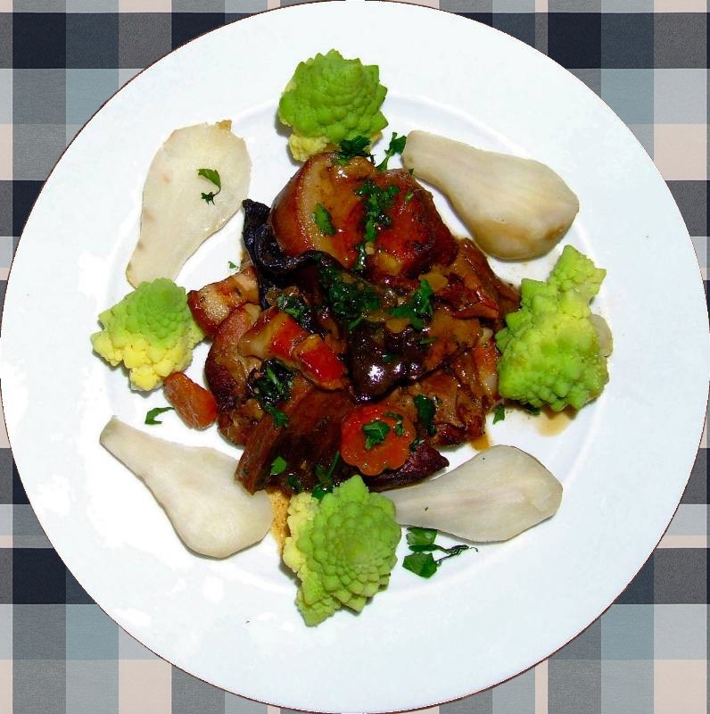 8-pendant ce temps mettre une grande casserole d'eau salée à bouillir, 30 minutes avant la fin de cuisson de la viande plonger les topinambours épluchés pendant 15 minutes ou plus selon grosseur (piquer avec la pointe d'un couteau pour vérifier la cuisson) 9-au bout de 15 minute retirer les topinambours à l'aide d'une écumoire et réserver, plonger à la place le chou romanesco coupé en bouquets pendant 10 minutes 10-au bout de 10 minutes égoutter le chou et réserver avec les topinambours 11-en fin de cuisson ajouter la gousse d'ail hachée, passer le jus de la cocotte au chinois et remettre sur le feu pour faire réduire jusqu'à obtention d'une sauce veloutée, poivrer et rectifier l'assaisonnement si nécessaire 12-dans des assiettes chaudes mettre la viande au centre, entourer alternativement de bouquets de chou et de topinambour coupé dans le sens de la longueur, napper de sauce parsemer de persil haché et servir aussitôt